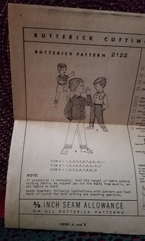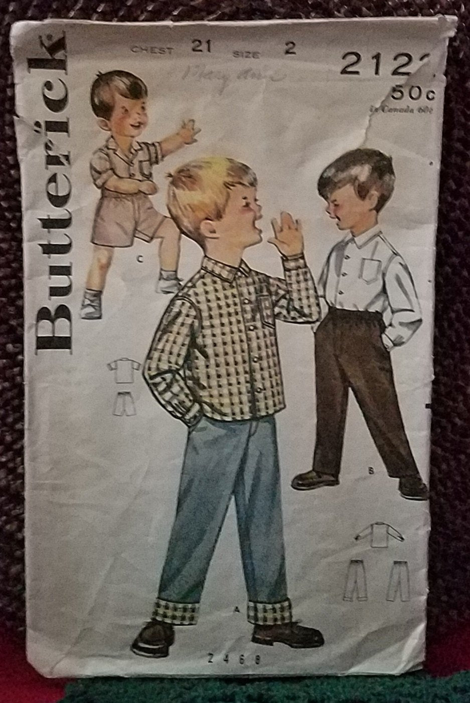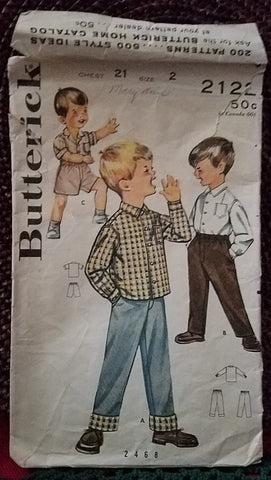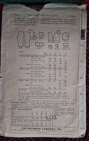 Butterick 2122 Pattern Boys' Pants And Sport Shirt Vintage SKU #B192017 - Sewing Pattern - Size 2 - CUT: 11 pattern pieces (all appears to be accounted for). Instructions are included; however worn from age (please see photo). "(A) Shirt with convertible collar, long band cuffed sleeves, patch pocket, top-stitch detail. Long pants with elasticized waistline, legs cuffed to match shirt. (B) Shirt same as view A. Cuffless pants. (C) Shirt with short sleeves, turn-back cuffs. Short pants." This is an 'As Is' purchase.