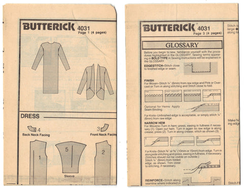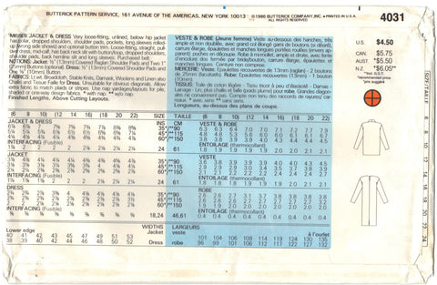Butterick 4031 Pattern Misses Jacket And Dress Size 18. 20. 22 UNCUT: Very loose-fitting, unlined, below hip jacket has collar, dropped shoulders, shoulder pads, pockets, long sleeves rolled-up (wrong side shows) and optional button trim. Loose-fitting, straight, pull-over dress, mid-calf, has back neck slit with button/loop, dropped shoulders, shoulder pads, back hemline slit and long sleeves. Purchased belt." Bonus! A Guide To Overlock Sewing. 10 Pattern Pieces are given, and accounted for (please, see photos). This is an 'As Is' purchase.
