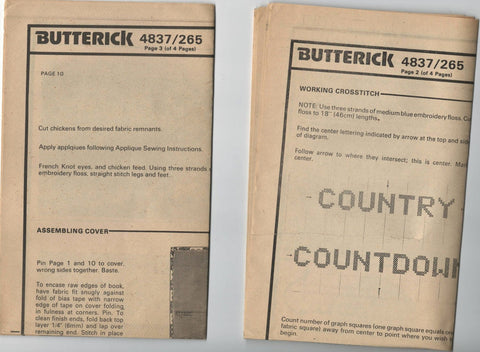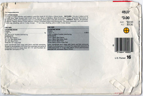 Butterick 4837 Craft Pattern Counting Book CUT: "Package includes transfer? and pattern piece for cloth 9" x 9" (23cm x 23cm) book." Please, see photos. A Learning how to count book for little ones. A lot of small-like cut pattern pieces, neatly, divided among plastic baggies. So many little pieces, I could only do my best to count. So, no guarantee. Materials made in, and from, the U.S.A. This pattern is used; and is an As-Is sale.