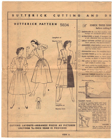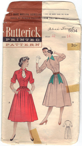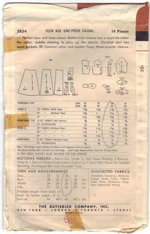 Butterick 5834 Pattern Teen Age One Piece Casual Size 14 Bust 32 Hip 35 CUT OOP/HTF: "(A) Perfect class and date casual. Button-front bodice has a smart tie under the collar, saddle stitching to play up the details. Dirndish skirt has seam pockets. (B) Contrast collar and pocket flaps; three-quarter sleeves." 14 Pattern Pieces. All of the pattern pieces (with light writing, a name) appear to be accounted for (as best as I can tell), and the pattern pieces are in good condition (please, see photos). The Front and Back (7 & 8) pattern pieces has been cut in half; it appears so that the length or width can be extended); however, the cut pieces are accounted for. The extension pieces are included, also. This is an 'As Is' purchase.