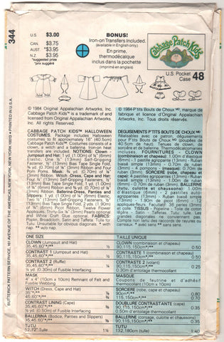 OOP. Rare. Clothes (costumes) For Cabbage Patch Kids Pattern (See picture). Iron on transfers included. Printed in USA. Copyright 1984. Partially cut. The majority of the pattern is uncut.  An 'AS IS' purchase.