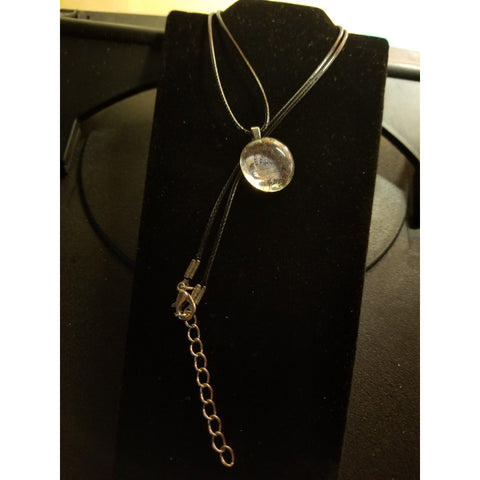 Cute Handmade Necklace (some crackling ... help give glittering effect, when light hits/shines on it). Flat Back Glass Marble. Approximately, 3/4 inch to under one inch circumference (please, see photos). Looking for unique, handmade, inexpensive; but, wearable, jewelry ... well, you came to the right place. Marble on black 24 inch waxed cotton cord chain with extender. Silver bail. IF AVAILABLE, can try to replace with 18 inch cord (cannot guarantee). Although, anyone can wear ... made with young ladies/girls, in mind. My daughters, their friends, etc., love them. My friends, and I, wear, also ...😉!