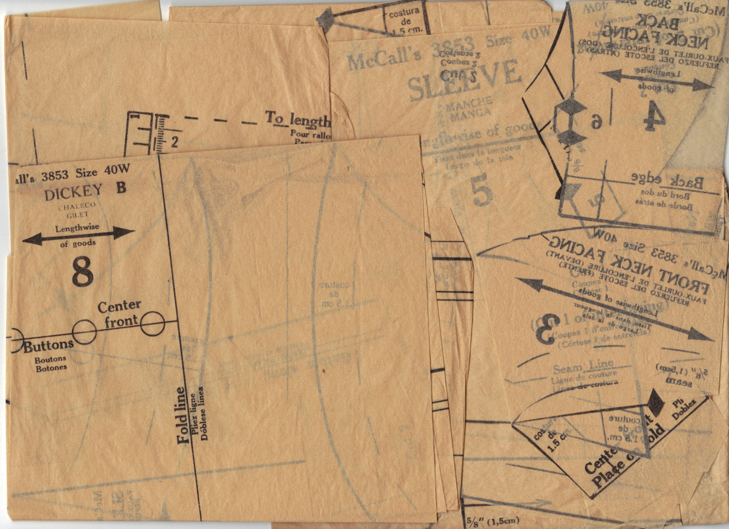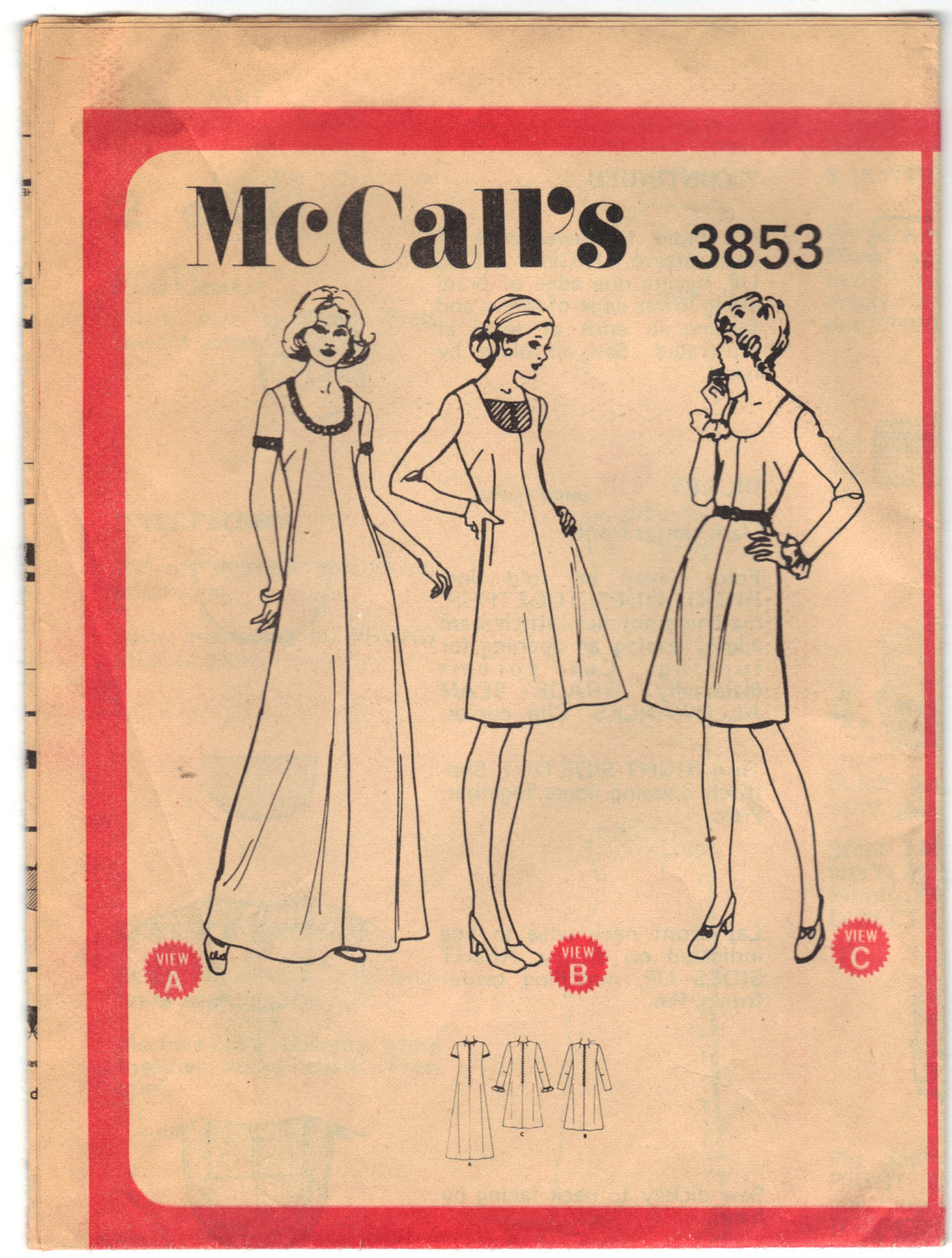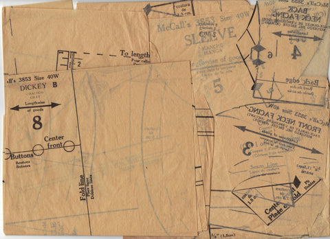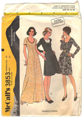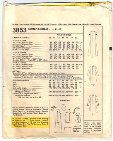 McCall's 3853 Pattern WOMEN'S DRESS Size 40 B44 CUT: EXTRA CAREFREE. A POUNDS-THINNER PATTERN. "Dress has back zipper. A has braid trim. B has button trimmed contrast dickey. C has sleeve ruffles." 8 pattern pieces; and all appears to be accounted for. This is an 'As Is' purchase.