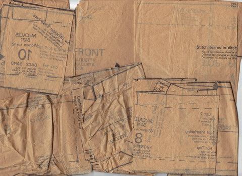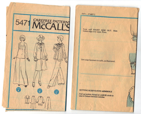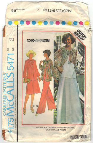McCalls 5471 Pattern - HTF Women and Misses Unlined Jacket, Top, Skirt, and Pants Size 42; BUST 46. CUT! Pounds Thinner Pattern (please, see photos). 16 pattern pieces, neatly cut, apart, and folded; and all appears to be accounted for. Envelope has full attached flap (please, see photo), and is worn, with some tears, etc.; however, it is in fair use-able condition. "Jacket with forward shoulder line has tie drawn thru neck casing, sleeves gathered into snapped cuffs. Top has bands, back zipper, shoulder straps, front inside tucks. Skirt and pants have left side zipper." This is an 'As Is' purchase.