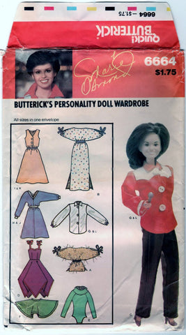 Butterick 6664 Pattern Personality Fashion Doll UNCUT: 30 piece doll clothes pattern. A Butterick's Personality Doll Wardrobe (Marie Osmond on this one). Suitable For 11 & 1/2" and 12 & 1/4" Tall Dolls. All sizes In One Envelope. Copyright 1980's (Best Estimate). Printed in USA. (please, see photos). This is an 'As Is' purchase.
