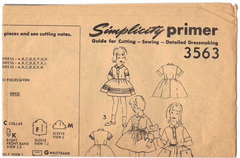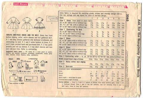 Simplicity 3563 Pattern Child One Piece Dress and Tie Belt Size 5 Breast 23 and 1/2 Waist 21 and 1/2 CUT: "Child’s One-Piece Dress and Tie Belt: Dress has front button closing, collar, set-in sleeves and full gathered skirt. V. 1 has long sleeves gathered into buttoned wristbands and contrasting tie belt. V. 1 and 2 collar buttons to dress. V. 2 and 3 have pointed band and purchased belt. V. 2 has patch pockets and roll up sleeves. V. 3 had short sleeves, lace and rick rack trim. Collar is contrasting."