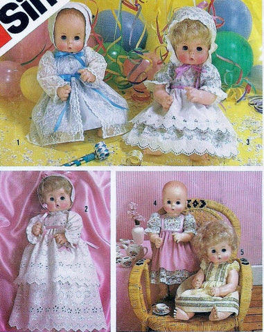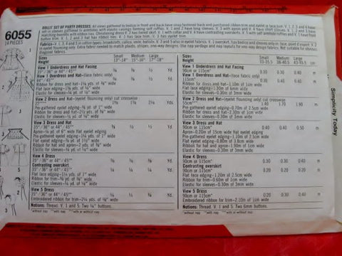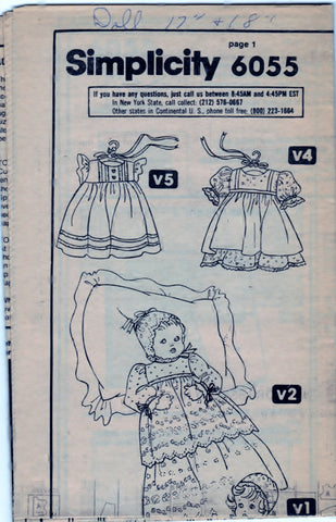 Simplicity 6055 Craft Supply Pattern Dolls Set Of Party Dresses - Large 17 and 18 Inch Dolls (Medium Size Pattern, 15 and 16 Inches, in another listing, also, being sold): "All views gathered to body in front and back have snap fastened back and purchased ribbon trim and eyelet or lace trim. View 1, 2, 3, and 4 have set-in sleeves gathered to armholes with elastic casings forming self ruffles. View 1 and 2 have long sleeves. V. 3 with apron and V. 4 have short sleeves. V. 1, 2, and 3 have matching bonnets with ribbon ties. Christening dress V. 2 has tiered skirt. V. 1 with collar and V. 4 have contrasting overskirts. V. 5 with self armhole ruffles and V. 1 have front button trim. V. 1, 2, and 3 hat has ribbon ties. V. 1 has lace trim. V. 3 has eyelet trim." A VINTAGE pattern. Pattern is UNCUT and still factory folded (please, see photos); however, the envelope is unavailable. Front and Back of envelope, pictured, are borrowed photos. The instruction is available. Copyright 1983 Simplicity Pattern Co., Inc. Printed in U.S.A. This is an 'As Is' purchase.