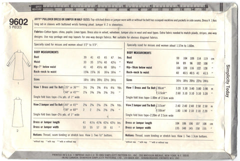 Simplicity 9602 Pattern Vintage Jiffy Pullover Dress or Jumper