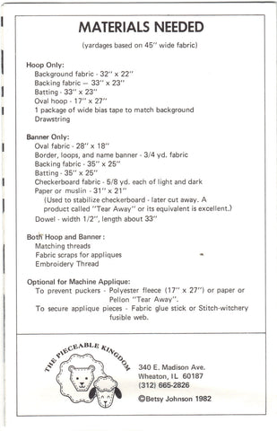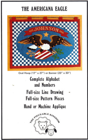 Re: The Americana Eagle - The Pieceable Kingdom. The model (photo): For one or the other ... The finished size of the Oval Hoop is 17" x 27" and the Banner is 23" x 33." This is a hand or machine applique pattern/kit. Included in pattern are complete alphabet and numbers, full-size line drawing, and full-size pattern pieces. Copyright Betsy Johnson 1982. This pattern is uncut; and is an As-Is purchase.