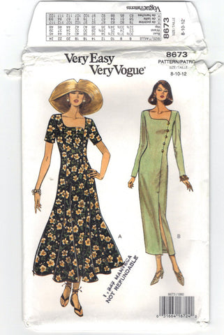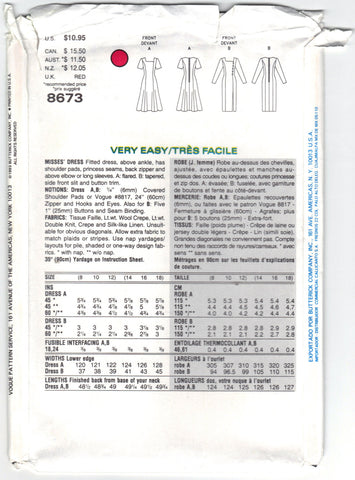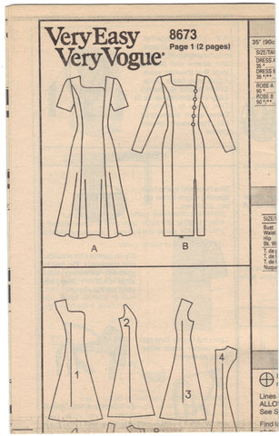 Vogue 8673 Pattern Very Easy Very Vogue Misses Dress Size 8-10-12 B31 1/2 - 32 1/2 - 34 UNCUT: "Misses' Dress Fitted dress, above ankle, has shoulder pads, princess seams, back zipper and above elbow or long sleeves. A: flared. B: tapered, side front slit and button trim." This pattern is uncut; and still factory folded (please, see photos). Stamp on envelope pattern front. This is an 'As Is' purchase.