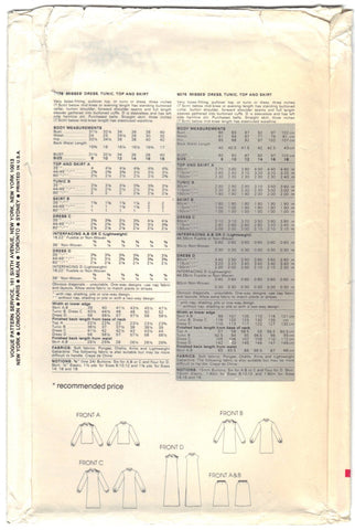 Vogue 8076 Pattern Vintage Very Easy Vogue Misses Dress, Tunic, Top, and Skirt Size 12 B34 UNCUT: "Very loose-fitting, pullover top, or tunic, or dress, three inches 7.5cm) below mid-knee or evening length has standing buttoned collar, button shoulder, forward shoulder seams and full length sleeves gathered into buttoned cuffs. D is sleeveless and has left side hemline slit. Purchased belts. Straight skirt, three inches (7.5cm) below mid-knee length has elasticized waistline." This is an 'As Is' purchase.