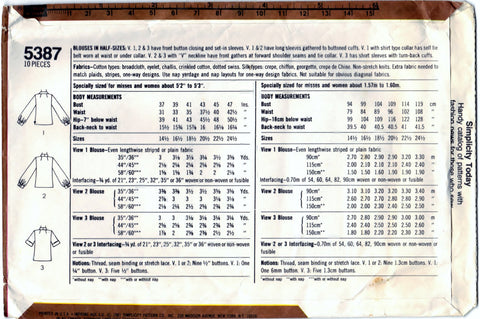 Simplicity 5387 Blouses In Half-Sizes Sizes 14 1/2 and 16 1/2 - B37 and 39: V. 1, 2 & 3 have front button closing and set-in sleeves. V. 1 & 2 have long sleeves gathered to buttoned cuffs. V. 1 with shirt type collar has self tie belt worn at waist or under collar. V. 2 & 3 with "V" neckline have front gathers at forward shoulder seams and tie collar. V. 3 has short sleeves with turn-back cuffs." 10 pieces given (please, see photos); AND UNCUT. This is an 'As-Is' purchase.