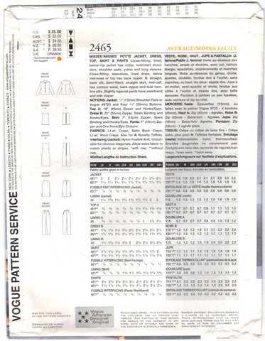 Vogue 2465 Pattern Misses Petite Jacket, Dress, Top, Skirt & Pants Size 12. 14. 16 B34. 36. 38 UNCUT