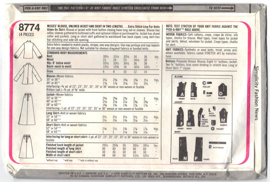 Simplicity 8774 Pattern Vintage Misses Blouse, Unlined Jacket And Skirt In Two Lengths