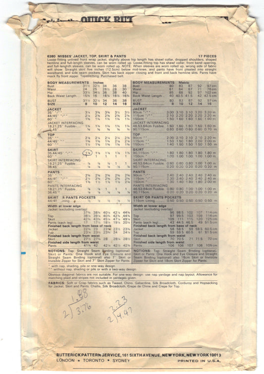 Butterick 6380 Pattern Vintage Misses Jacket, Top, Skirt & Pants